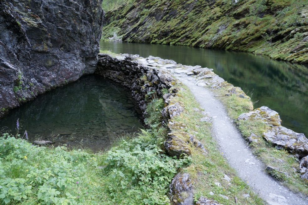 This 40 km long valley once had 10 farms! No there are none although some of the houses still are used as cabins and lodges. The valley is from old the shortest road from east to west Norway and used in thousands of years. Even livestock was brought on their own legs down the valley - before 1930 though they had to take another route at the ridges due to the vertical cliffs with only ladders of rope and wood for people. Highest up (1200m) it is a rather flat valley but farther down it is formed by ice and running water to a canyon. The valley was probably inhabited already in the Middle Ages. Before that hunters and fishermen used the valley, and traders from east to west and vice verse. The last farmer of Sinjarheim died in 1935.