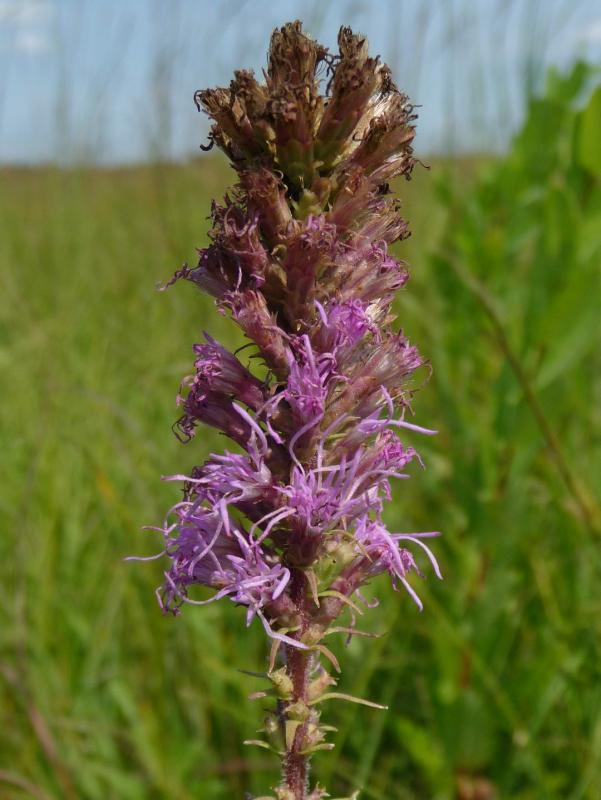 Liatris aspera (Rough Blazing Star) with Dalea sp. seedheads.  Flowers are pink-lavender, and the white bracts will darken a bit with age.  Pics 2 and 3 are Liatris pychnostachya (Prairie Blazing Star).  It has one of the hairiest stems of all the liatris species.