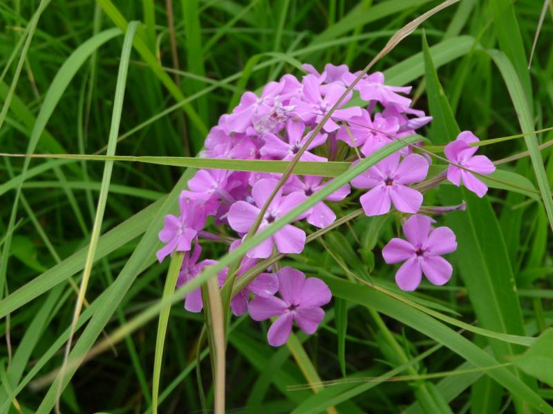 An unusually floriferous head of Phlox pilosa, Hesperostipa spartea (Stipa spartea), Pycnanthemum tenuifolium..