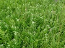Ripe Thalictrum dasycarpum achenes. The species' foliage becomes even more glabrous as the season progresses.  Allium stellatum.