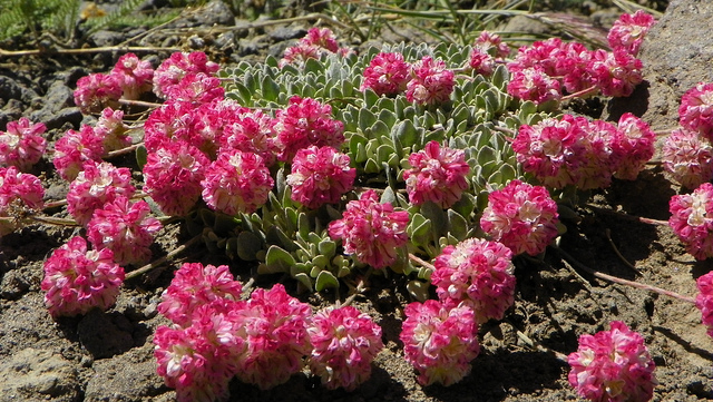 The thousands of plants in this thriving population of Eriogonum ovalifolium form outstanding gray/green cushions 6-10" (15.25-25.4 cm)across and no higher than 1" ( 2.5 cm) tall. The flowers splay out across the foliage attached by short stems. The capitate flower inflorescence are various shades of pink with many intensely pink individuals along side pastel examples. I did happen to find one plant who's flowers were pale yellow with a flush of pink, a stand out among the crowd.
