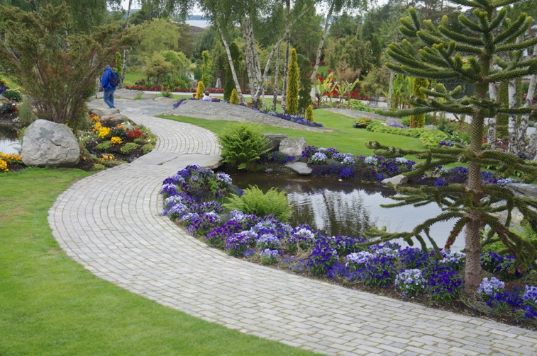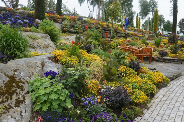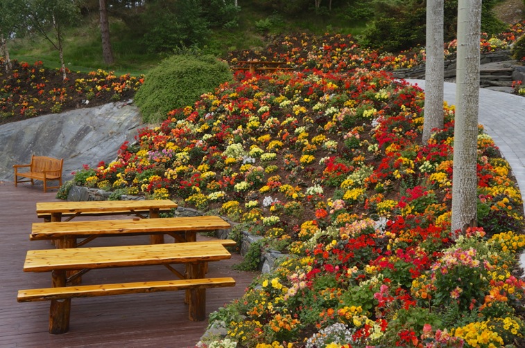 The garden is planted with 50000 annuals every year in a framework of trees and shrubs, small lakes, creeks and paths. Some of the exotic shrubs and palms are brought inside during the winter. The climate is mild so some exotics like the old olive tree stay outside all year.
