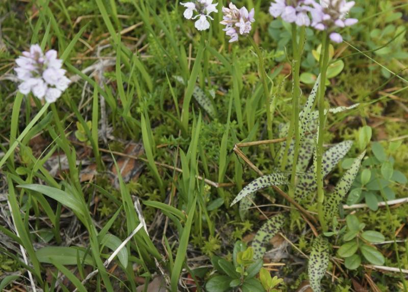 Was on a little hike yesterday in an area with mostly poor peaty soil but I spotted 4 different orchid species. The commonest (evereywher in fact) was Dactylorhiza maculata which come in many hues. The flowers can be almost white with little markings and almost pink with heavy markings. The leaves can be plain green or reddish with lots of dark spots.