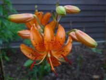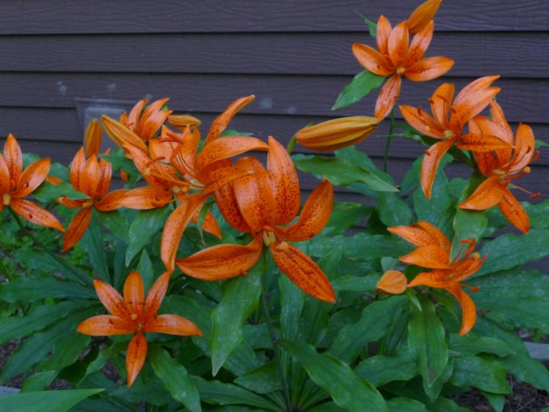 Lilium canadense, grown from NARGS seed exchange seed, in full bloom mid-June.  There is quite a variation in spots on the petals.  The gold flowers have large, dark spots and the orange flowers have smaller, lighter spots.