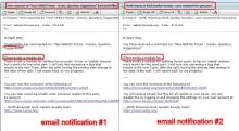 I notice that I sometimes get two email notifications for the same reply. They're slightly different, one indicates who made the comment, and the other one does not. And, the unsubscribe link is different. I prefer the version with the commentor's name. I attach a photo showing the two messages in my email InBox side-by-side. Is there a reason why the first line of the text is cut-off then the full line of text appearing on the second line?