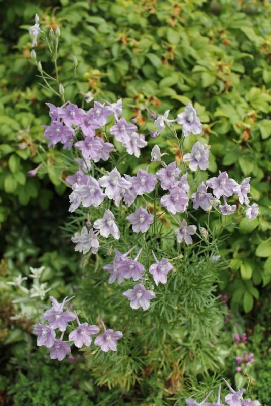 Adenophora remotiflora f. album, a rather spready and floppy thing, even amongst the competition in the border; Lallemantia canescens; Symphyandra zanzegur; the first of Delphinium grandiflorum, which will be blooming en masse soon; a white-flowered Verbascum, possibly Verbascum chaixii 'Album' but not sure what sorts of cross-pollination have gone on over the years!