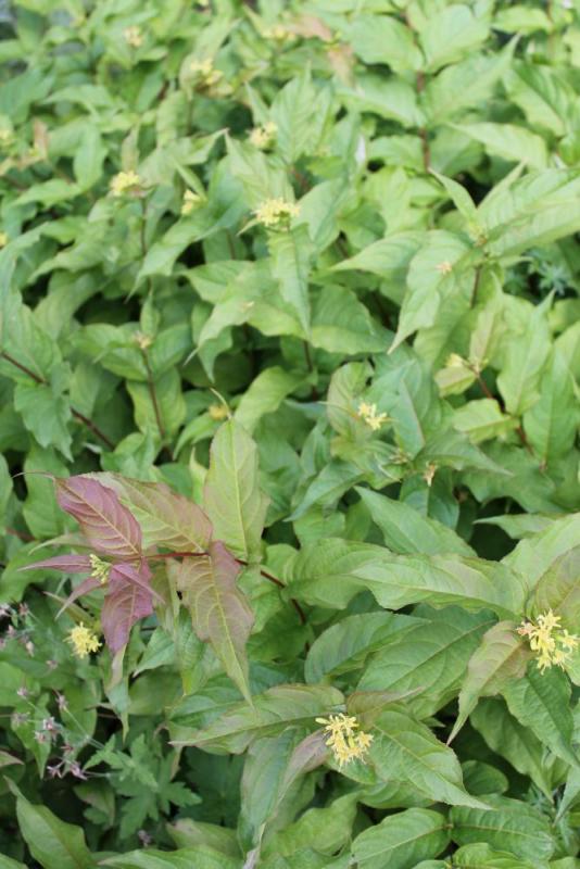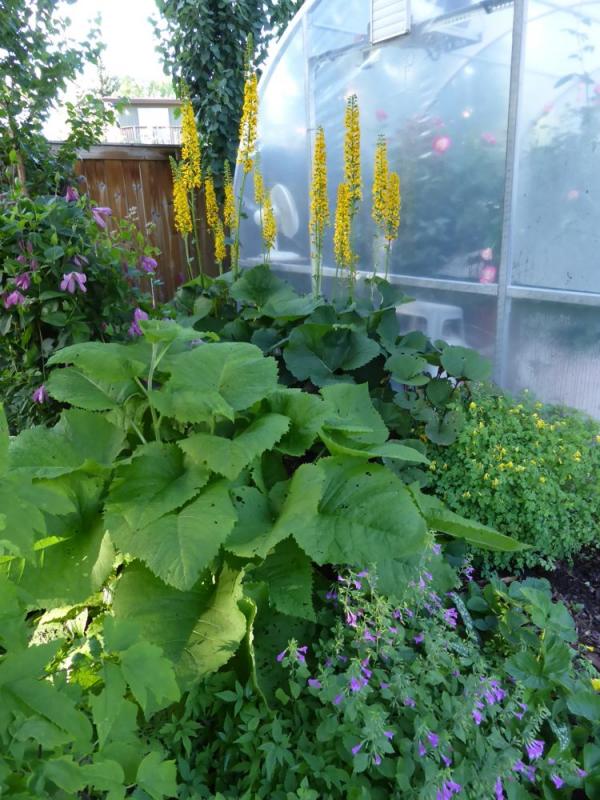 Diervilla lonicera, in bloom and starting to turn bronzy; Telekia speciosa, an imposing perennial; Campanula stricta var. alidagensis, a very dry-textured, broad-spreading (in shape, I mean - it's tap-rooted) Campanula: