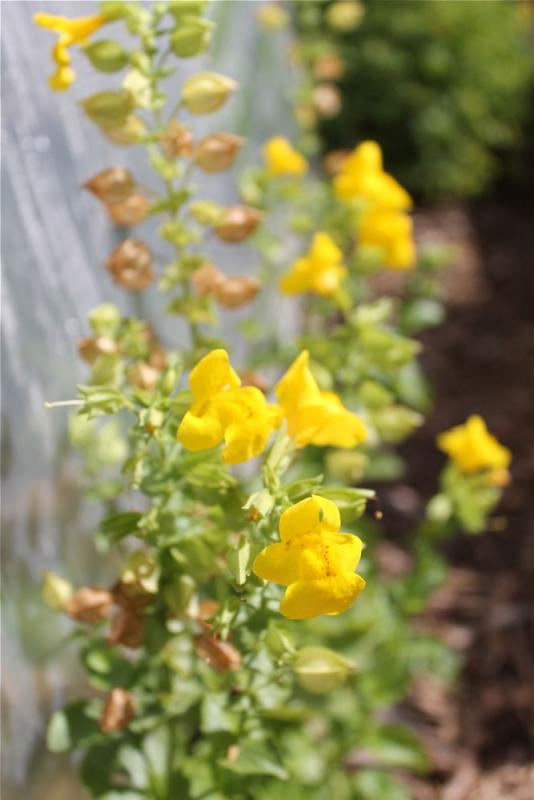 Update on Cerinthe major purpurascens, much taller than I recall from when I grew it long ago; Mimulus guttatus along the edge of the greenhouse; Linum flavum compactum: