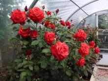 After an extremely heavy first flush, DH's roses in the greenhouse are setting up again. 'Dolly Parton':