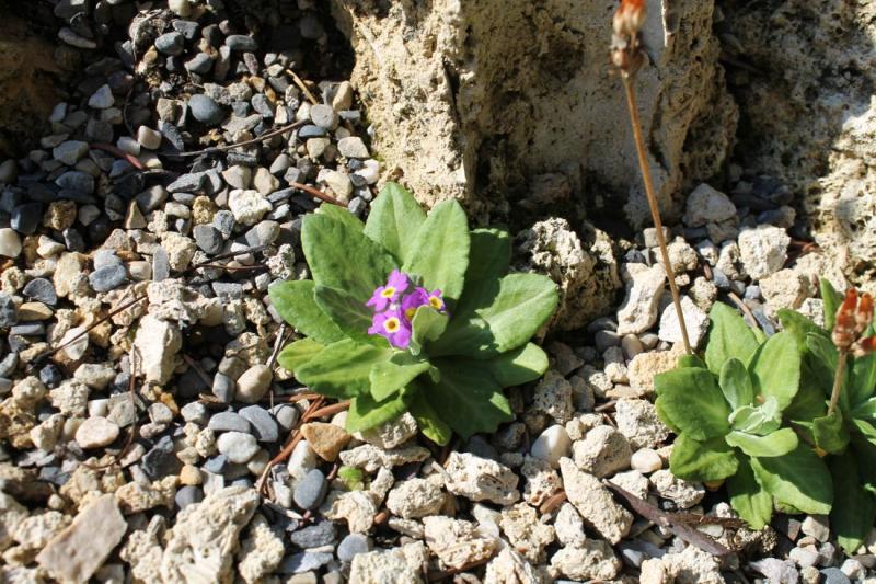 Synthyris pinnatifida v. canescens; Achillea gypsicola; a striped bud coming along on Gentiana vietchiorum (essentially invisible in the photo, sorry!), from seed in 2011; Primula scotica (yet again); Cystopteris fragilis and little mushrooms: