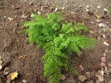 I'm looking to add more ferns to my garden, here's a recent addition from Broken Arrow Nursery in Connecticut, the Upside-down Fern, Arachnoides standishii. The leaves do give the false appearance of the leaves being upside-down.