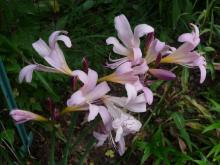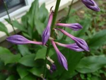 Lycoris squamigera and Rosa x 'PEJamore' first year on a shrub rose that may not be hardy here.  Hosta clausa var. clausa.  Buds never open, but oh the metallic colors!