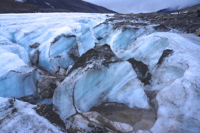 Left pic: The white clad person stands where the glacier reached in 2004, the blue clad person where the glacier was in 1990. You can see the limit of the ice where it was in 1936 in the upper left corner. The right pic shows the dead ice slowly melting.