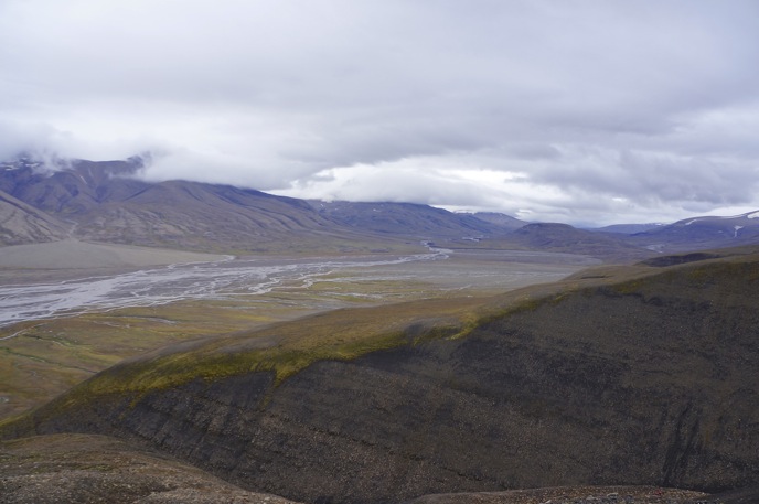 View of Longyeardalen (-valley). The debris is full of fossils particularly of plants form early tertiary woods. The conifer is Metasequoia occidentalis. Metasequoia, Taxodium and Larix are adapted to midnight sun and winter darkness (they are deciduous).