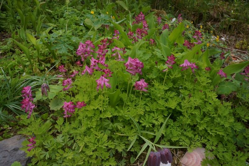 Corydalis buschii and an unnamed blue one. A branch of Clematis alpina is flowering in the dense shade under the yew.
