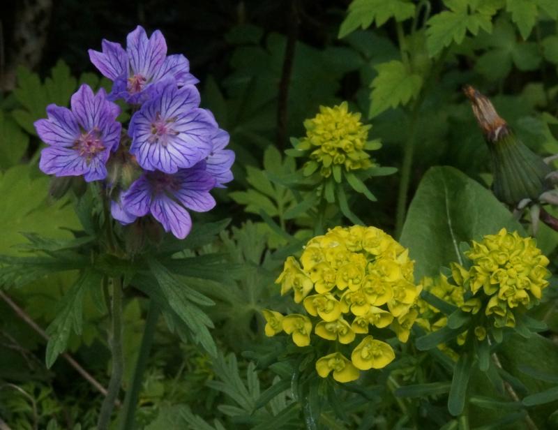 Geranium tuberosum and a Euphorbia. Pieris 'Forest Flame'. Ranunculis amplexicaulis