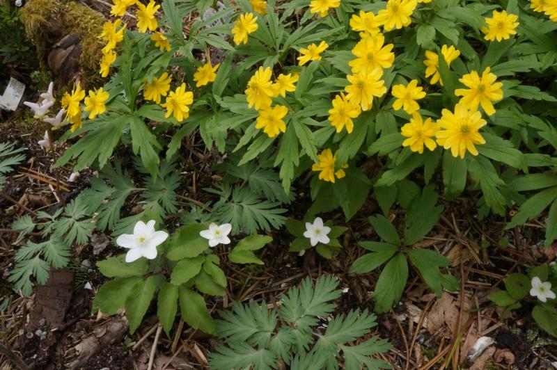 I have also several clones of Anemone ranunculoides. Here is a semi plena form. And a couple of Anemone trifolia fighting for space with its yellow relative.