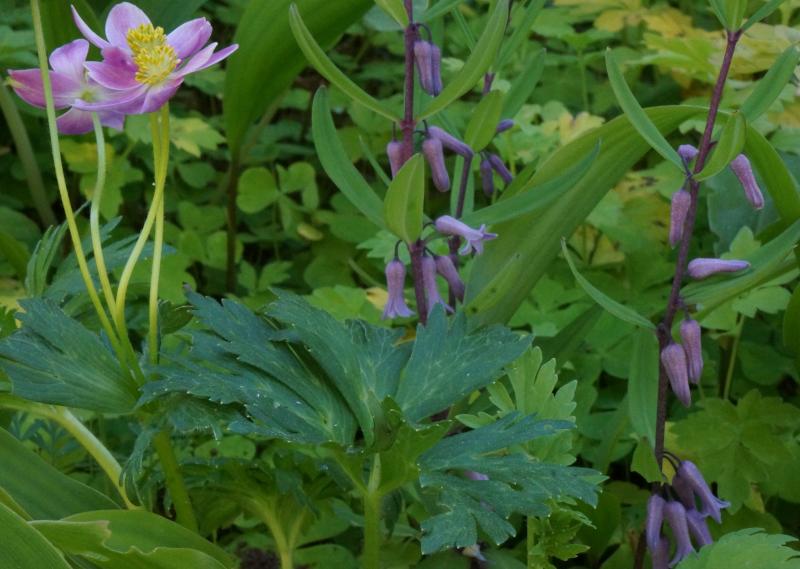Allium triquetrum    Anemone narcissiflora(?) pink form from seed several years ago - first flowers. Polygonatum prattii(?)