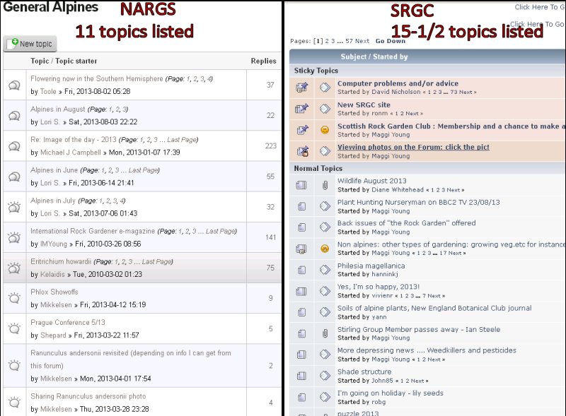 Regarding scrolling, I don't share the same level of concern; here's a side-by-side space comparison looking at the General Forum on NARGS (left) and SRGC (right), seeing a few more topics listed on the SRGC site because it is more compact displaying text; I don't feel is cause for concern.