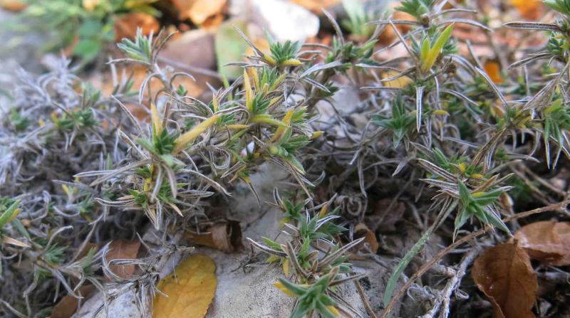 "Perennial forming loose mats, 5cm or less high .....leaves very stiff and pungent, mostly lanceolate or lance-linear. 4-8mm long, 1-1.5 (2mm) wide, pubescent. often glandular, ciliate, punctate, the margins and dorsal midrib strongly thickened, gradually tapering into a sharp terminal bristle..."). (From Dorn's Vascular Plants of Wyoming, 1988.)