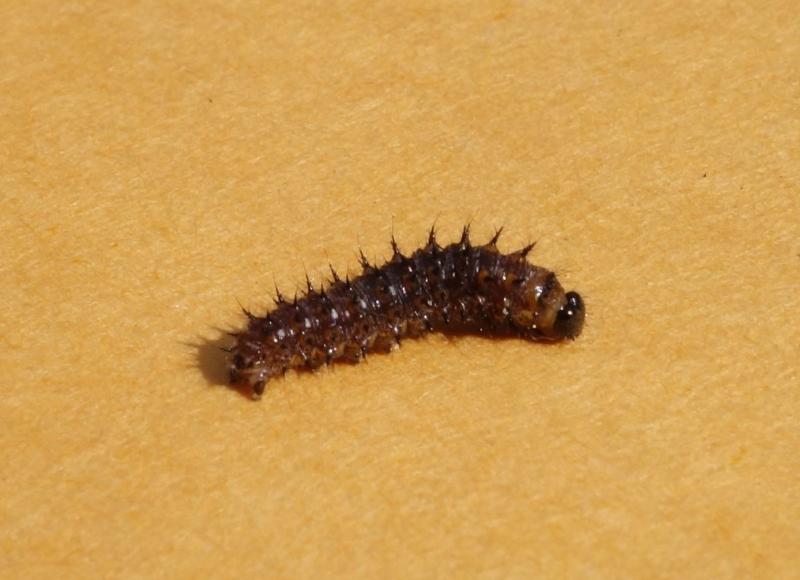 It has turned out to be a Vanessa sp. June 19, it is now 4 cm. Surprisingly, they have not done much damage at all to the plants. It makes me wonder what they are eating!