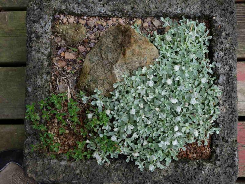 Seedling of Artemisia filifolius - hoping it winters over; a little fall colour on Draba ventosa and unknown Draba sp.:
