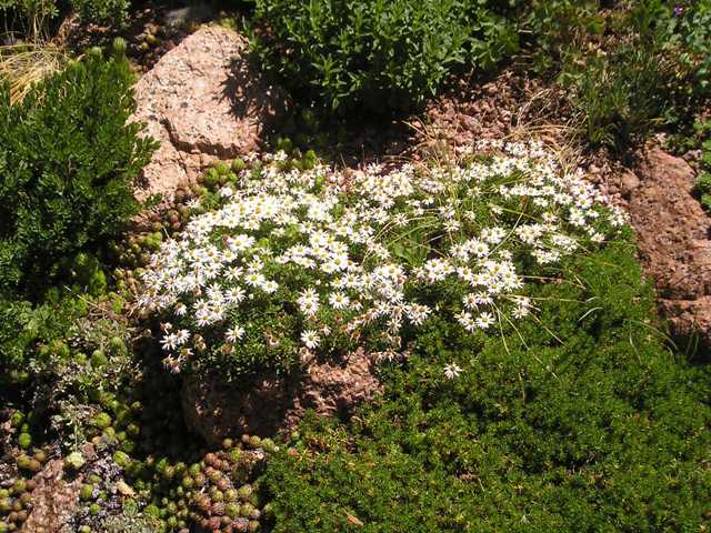 I can't think of a better Erigeron to launch this discussion than E. scopulinus, which is still relatively new both to science and cultivation in the broadest sense. This is not only one of the toughest, one of the daintiest and most beautiful of tiny mat formers, it is very rare in nature--only known from a few spots on the Mogollon rim of New Mexico and Arizona. It was introduced to cultivation by Sonia Lowzow, a remarkable woman and grower who lived in Showlow Arizona (Lowzow from Showlow was quite the tongue twister). I visited her in April of 1983 and was enchanted with the remarkable area she lived in: she could grow Meconopsis superbly, but lived not far from where Agave parryi has its northernmost colonies--truly an amazing place. She gave me my first E. scopulinus, and I know she shared it widely through her mail order operation. I doubt if the plant has ever been recollected since she first obtained a tiny piece. Interestingly enough, I do not know of anyone obtaining viable seed from it: I believe most erigerons are self fertile, or even apomictic. I would be curious if any of you have ever grown it from seed...