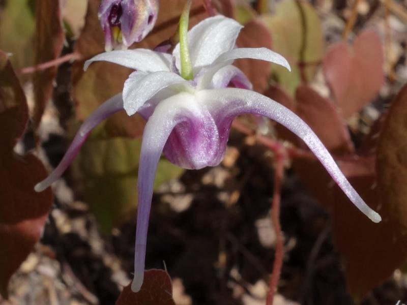 A seedling of Epimedium 'Rose Queen' that I pick up at our local Chapter plant sale. Not the best color, but I love how the white sepals "float" above the petals.