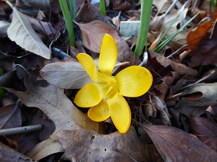 This clump of Crocus flavus is unfortunately under a Mexican Hawthorn and the fallen fruit is the same color as the crocus flowers, so sometimes they go unnoticed for awhile!