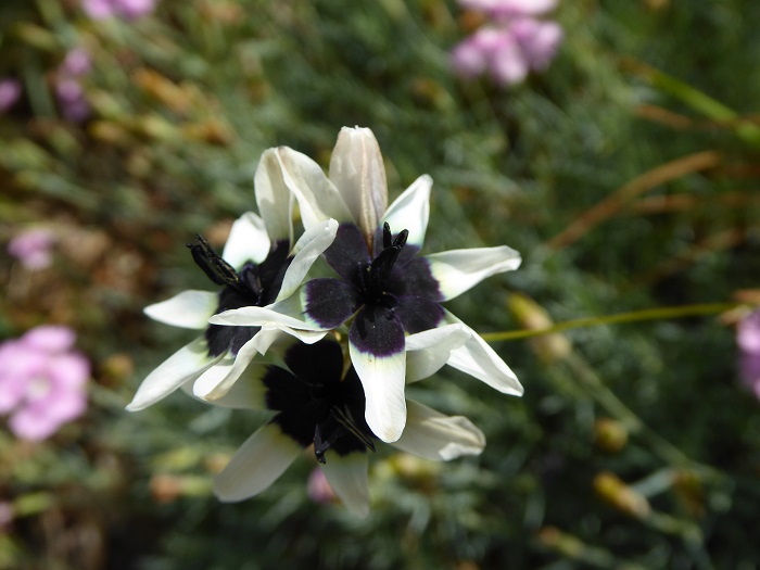 This is Ixia rouxii, a species with black centers which can be stunning when in full flower but quickly become untidy when they start to fade,
