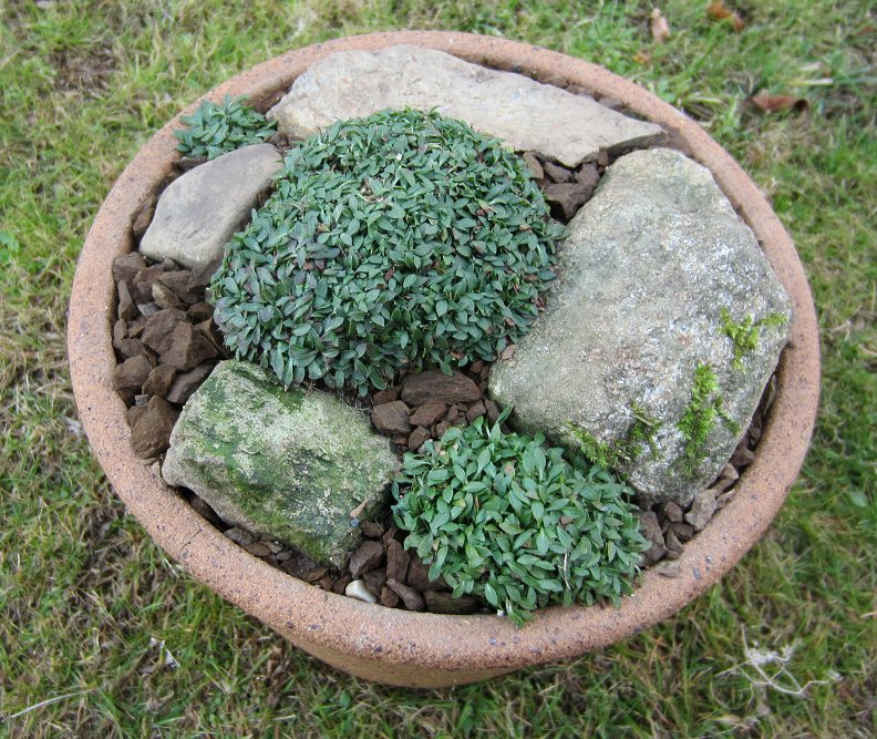 Sun, 11/17/2013 - 7:53pmReviving an old post here. Yesterday I potted up a dense domed hummock of Houstonia careulea, plus a couple seedling clumps from it, into a clay pot, to enjoy the evergreen mounds over winter on my deck. The pot is from Grand Ridge Nursery (Phil Pearson, Steve Doonan) of Issaquah Washington, that I brought back with me when I returned to Massachusetts in 1986 after a 4 years living near Seattle Washington. These pots are special, beautiful high-fire pots designed to resist winter breakage, intended for alpine plants; 26 years years outside and planted and still intact. Using indigenous rock (all I need to do is dig a hole to unearth lots and lots of such rocks), the stone mulch, while appearing a different color, is the same crumbling rock that I break up with a hammer.