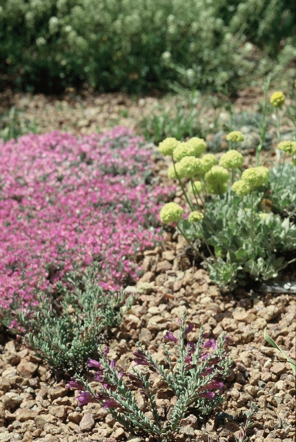 The choicest milkvetch in the immediate Denver area is this tiny cushion plant: pretty much restricted to the foothill rock outcrops near Denver up to central Wyoming. It can make huge cushions, like vegetable sheep, in parts of it range. It is one of a half dozen "Orophaca": this has been used as a sectional name and also an attempted generic. They are the densest, most wonderful cushion plants in the genus--centered in Wyoming and northern Colorado. Astragalus gilviflorus shown in the other post is in this group (the least cushiony of all). The biggest cushions are formed by Astragalus hyalinus, and those can be three feet across and very hummocky. Alas, it has inconspicuous lilac flowers. The real queens of the Orophaca section are A. tridacylicus, A. sericoleucus and A. aretioides, all of them forming dense cushions studded with tiny pink flowers: they are distinguished by all sorts of minutiae, and all three are worth growing. This one was in my old garden on Eudora: must get it back! The yellow is Eriogonum ovalifolium from the Uinta Basin. Penstemon thompsoniae in front.
