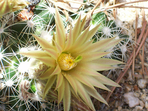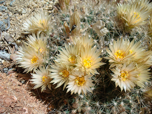 The form found in that part of the country grows very low to the ground (almost flat)tucked in amongst the short bunch grasses, on the dry sloping flanks of clay buttes and gravely knolls. It is confined to the south western portion of the state in what, for a better term, is know as the "bad lands". The spines are thin and wiry with few to no central spines. (a user friendly cacti) It can take considerable moisture and and in most years is the second cacti to bloom for me.(only preceded by Pediocactus) Fertile seed are encased in small bright red, berry shaped fruits ,that can persist attached to the plant for up to two years. There is some variation in spine coloration from white though amber. Once in a while a black spined plant may be discovered. These northern forms bloom with the blossoms in clusters. The petals are always a pale straw color with an embossed button of yellow stamens.
