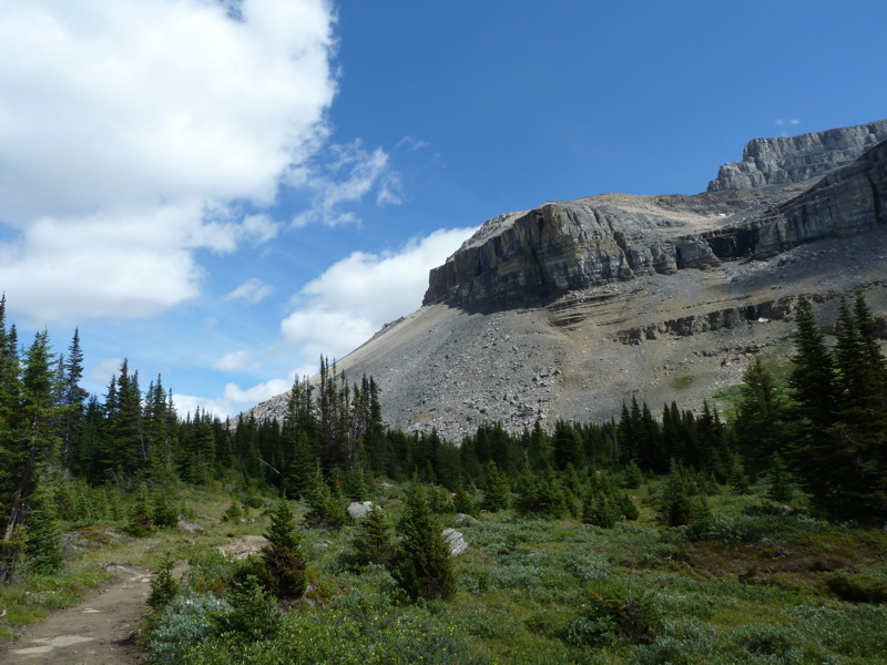 1) Leaving the forest and looking west from meadow, at Mount Temple and the Seven Sisters, in the distance