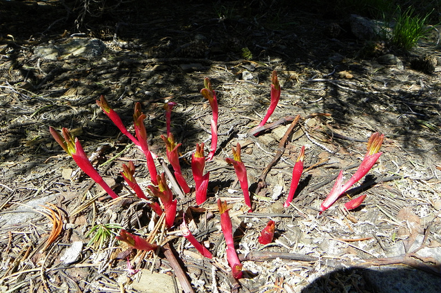 I photographed these new shoots emerging at the base of a clump of Whitebark pine(Pinus albicaulis). The location is Alpine County, CA, USA. On the trail from Carson Pass to Winnemucca Lake. We had just passed Frog Lake the elevation was in the region of 8600' (2 621m). I feel it may be a hemiparasitic species due to it's late emergence. This plant was just emerging in late July.