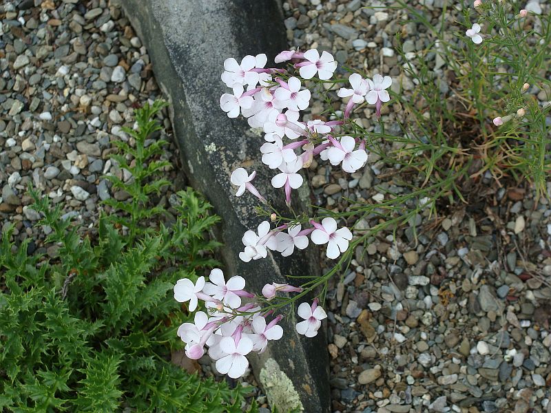 Some years ago along an Arizona highway in the middle of nowhere, I saw Penstemon ambiguus in bloom and fell instantly in love. The clumps were scattered and about 18" high in full bloom. After taking many pictures (all slides, alas), I carefully noted the kind of soil in which it grew (sand, old sparkplugs, shredded bits of rubber from tire blowouts, sand, cigarette stubs). I grew it from seed and ended up with half a dozen seedlings ready to plant. They were planted in different spots in the garden. Three died quite quickly when we had rain on and off for several weeks. Three made it in the sand bed but only one looked really strong. That is the one that survives still in the sand bed (very coarse sand and nothing else). It blooms each year and each year it looks better. It's so different from any other penstemon I grow. I think you can see the difference in the flower shape from the pictures, it's quite open and flat. The flowers are large and very lovely. The color looks the same as the wild plants I saw. It is considered xeric but it is an example of why you should never listen when people say something won't grow in the northeast or wherever you happen to live - you never know when something will decide it's found a second home.