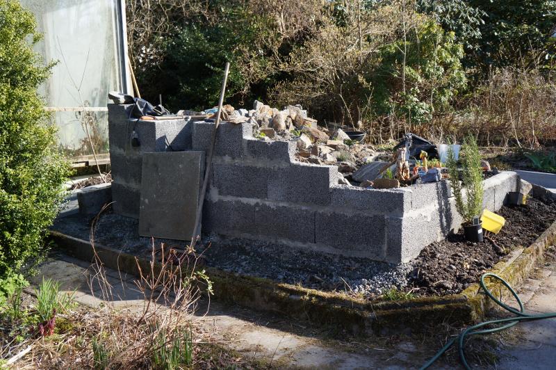 My old shed with the !rock garden! in the background. The "slope" faces south and will have a little watercourse too. The frame is built of expanded clay blocks (leca). The north facing side looks at present like a foundation for a house!