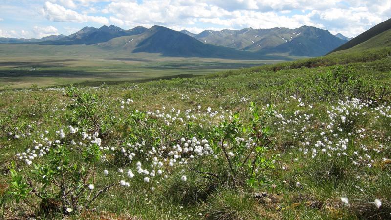 The Dempster Highway near North Fork Pass is easily accessible from Dawson City (of Goldrush fame), and one can stop anywhere and hike into the tussocks formed by cotton-grass and other sedges, interspersed with bogs underlain in many places by permafrost: