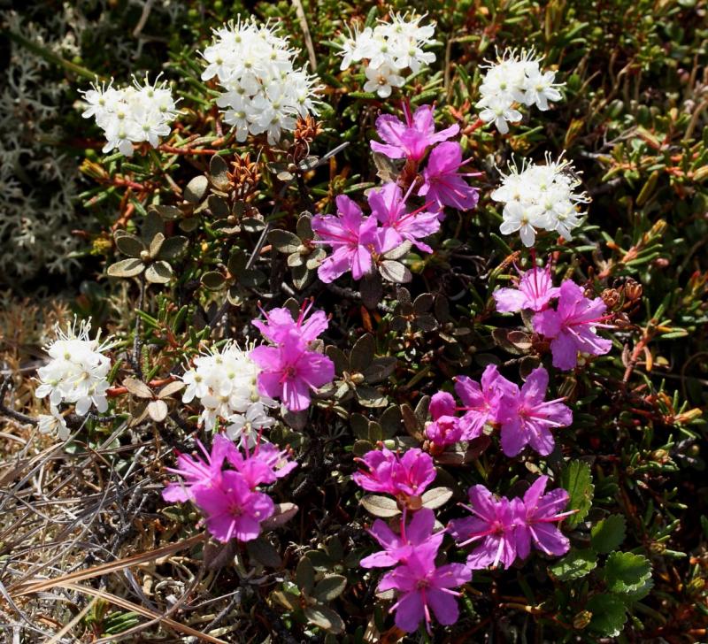 Wouldn't Lapland Rosebay (Rhododendron lapponicum) be a wonderful plant in the rock garden? It must be difficult to cultivate. We also saw it in drier situation in northern BC near the Alaska Hwy, definitely in limestone mountains rather than acid soil. Here is is with some Ledum decumbens among the boggy tussocks...