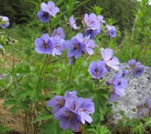 Around here in wet areas there is Geranium erianthum - an ethereal blue. Surely someone tries to grow this -- ironically we found some growing on the roadsides in the small town of Watson Lake, Yukon, but I don't think it was cultivated: