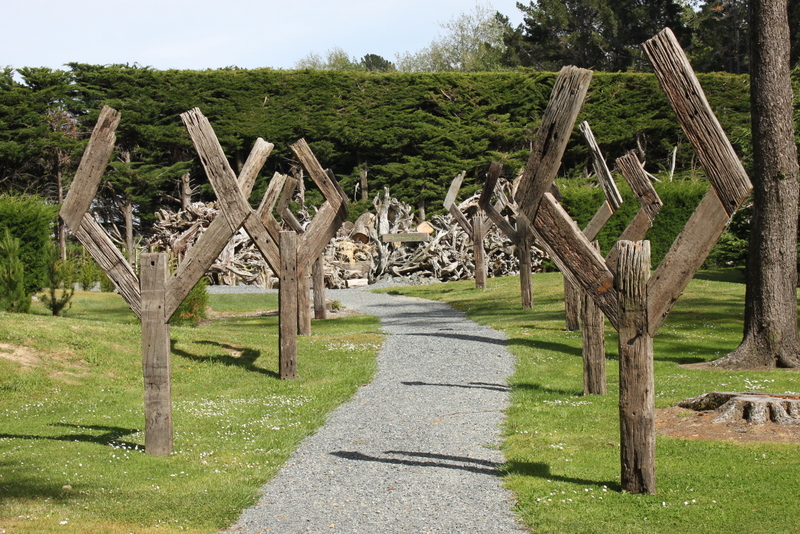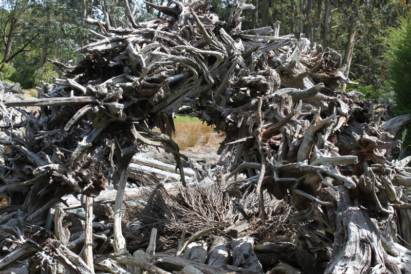 At a distance the site looked like the after effects of a logging operation however as i got closer i started to appreciate the skilled sculptural work especially the use of the smaller stumps with roots for the crowning of numerous poles.