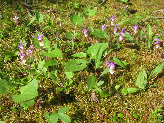 Calypso is not rare here, but not common either, though not forming large patches generally, probably since it favours semi damp mixed wood spots which are unstable (growing over and becoming too shady, short lived trees falling, etc)..