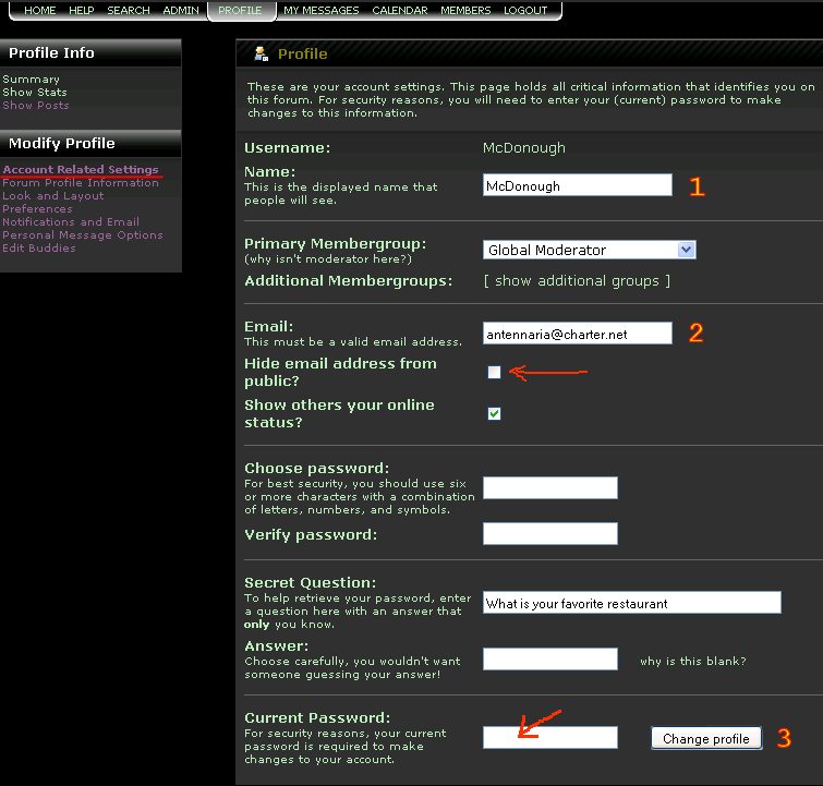Username: by default everyone is assigned a username on the forum that is their last name. Most people leave their username as it was setup. However, if you want to change your username, enter a new username in the Username field (photo item 1), then enter your Current Password (for security reasons, your password is required when globally changing your username), then click on Change Profile (photo item 3).