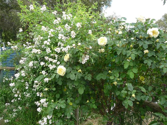 In a sunnier part, we had a standard rose 'The Pilgrim' on each side of a gate. When one died the understock took over and we now have a bower!