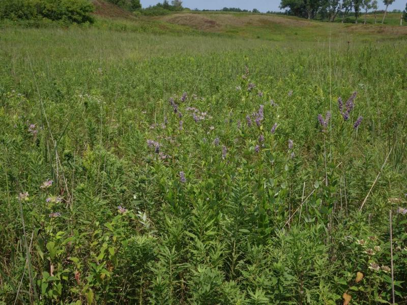 Many of the stalwarts of moist (as well as mesic) prairie habitat were present n the low parts: Vernonia fasiculata (the bit of purple in the center) among a sea of goldenrod, Big Bluestem, etc. Second pic, Agastache foeniculum. Third pic, A. foeniculum with Monarda fistulosa (left and right), and Monard fistulosa.