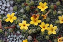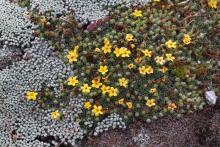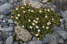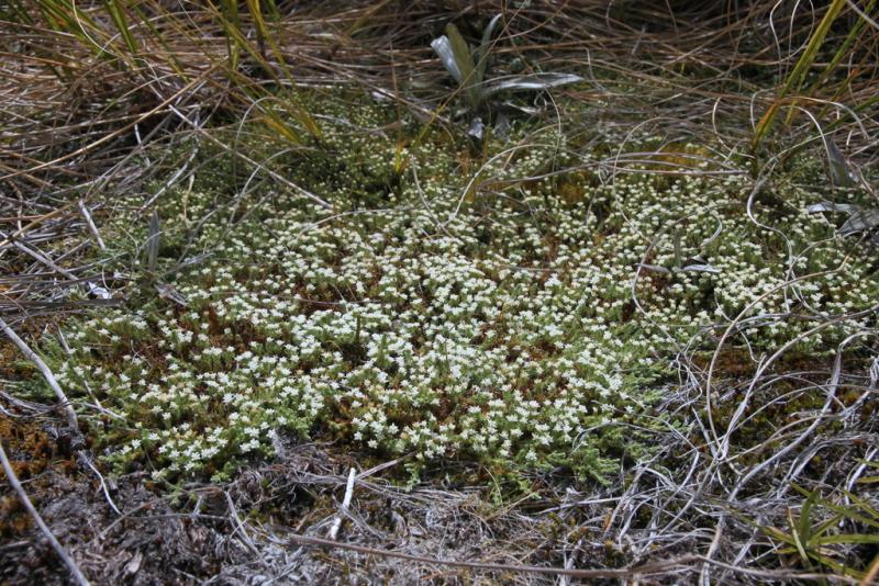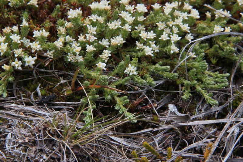 A creeping Kelleria sps and close up, growing amongst the snow tussocks.