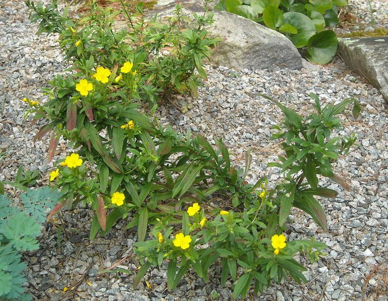 I was given this little "evening primrose", an Oenothera species, by gardening friend Marsha Russell who lives nearby. It is rather different than most Oenothera, starting out with the typical rosettes, but then springing with stiff woody stems to about 12", with small cauline leaves along the length, some larger leaves near the top, and sprouting very small bright yellow flowers all summer long.