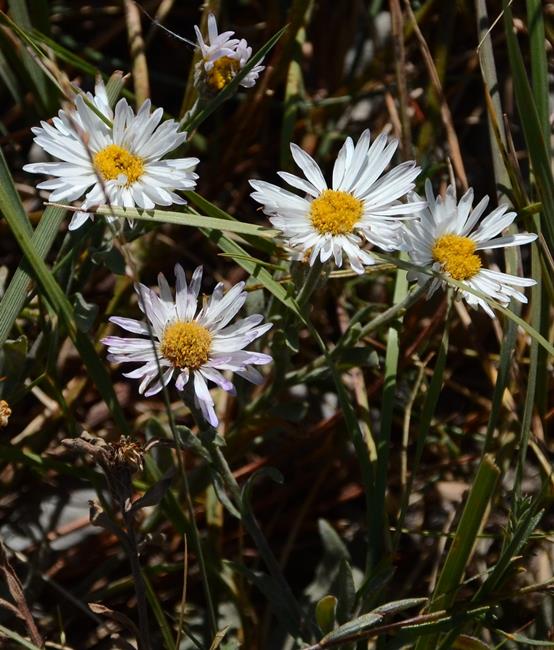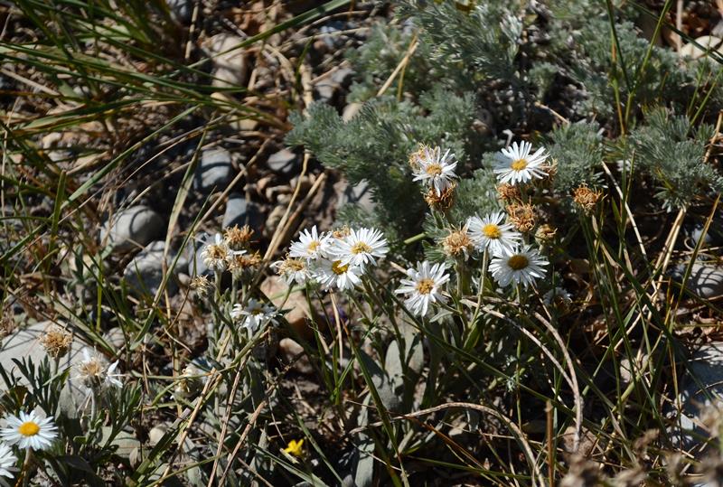 Lori- I could easily be wrong, but this photo is not that representative, just a pretty shot not a botanical one, I'll post some others. Whatever it is, it is very common in these dry montane (if I'm using the term right) areas in the Kootenay Plains, and based on shape and greyish glaucous foliage and small stature (maybe 30cm tall at most, generally low and sprawling, at least in dry spots) it seems like a good fit for Erigeron caespitosus. I haven't recently gone through all the Erigeron possibilities, but I was going through the Asters yesterday looking for something else, and I did not see any small glaucous white Asters (of course, could have missed it).These flowers were all pretty much white, but I've seen them in the past with a hint of lavender- might be about temperature as well. In the photo this sort of resembles our white marsh asters (maybe borealis or similar) but the plants are not at all alike.