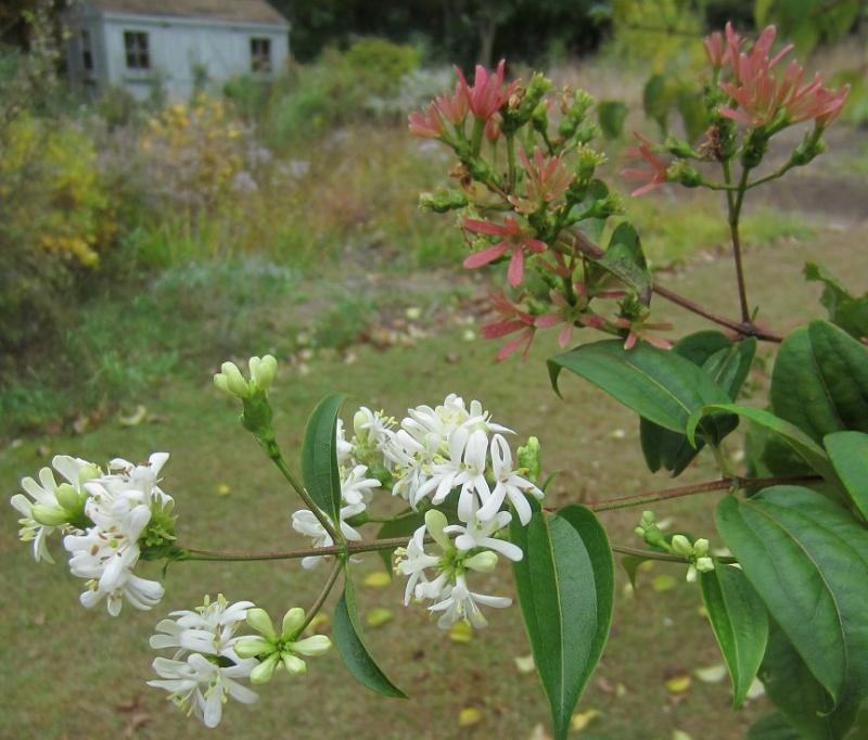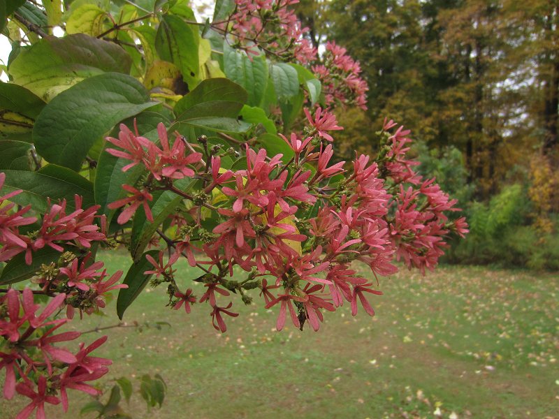 Tue, 10/15/2013 - 4:56amTwo views of the Seven Son Flower, a small Chinese tree, Heptacodium miconioides (syn. H. jaminoides), introduced to cultivation in North American by Arnold Arboretum (near Boston, Massachusetts), around the early 1900s. It is very hardy and ornamental, flowering in September with clusters of small white flowers that are scented like jasmine or gardenia (drives the bees into a frenzy), but the real show is after the flowers, when the calyx lobes expand and turn a bright pink to red color. The tree also has pale shredding bark, and handsome peach-tree-like leaves, a really good tree all around.