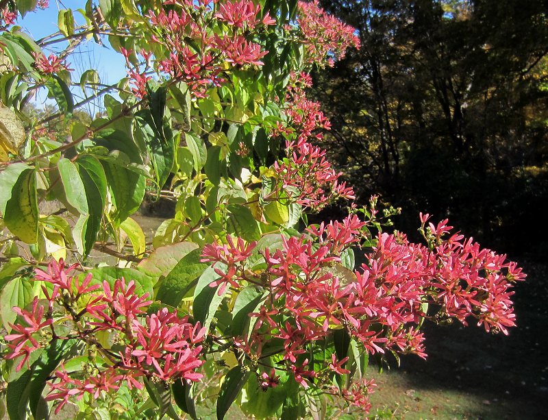 Two views of the Seven Son Flower, a small Chinese tree, Heptacodium miconioides (syn. H. jaminoides), introduced to cultivation in North American by Arnold Arboretum (near Boston, Massachusetts), around the early 1900s. It is very hardy and ornamental, flowering in September with clusters of small white flowers that are scented like jasmine or gardenia (drives the bees into a frenzy), but the real show is after the flowers, when the calyx lobes expand and turn a bright pink to red color. The tree also has pale shredding bark, and handsome peach-tree-like leaves, a really good tree all around.